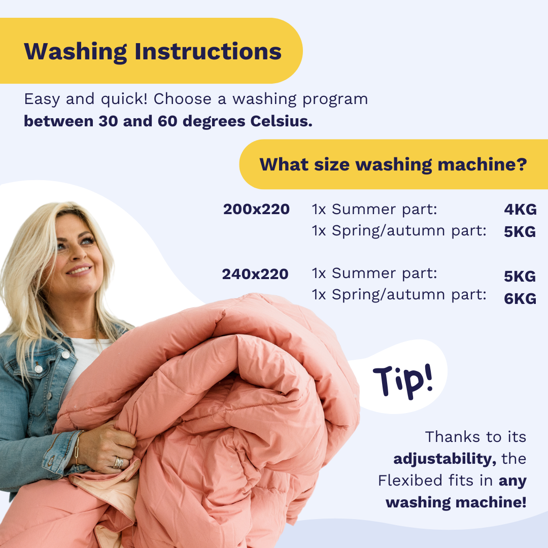 We recommend using a maximum washing temperature of 60 degrees and a maximum spin speed of 1000 revolutions (40 degrees and 800 revolutions for optimal product life). Following these washing instructions will ensure that your duvet feels fresh, hygienic and like new. In addition, washing at this temperature will remove dried-on stains, mites, mould and bacteria from your duvet.