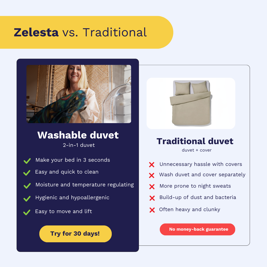 With Zelesta, that nightmare is over. Our smart duvets with integrated duvet cover save time, energy and money.