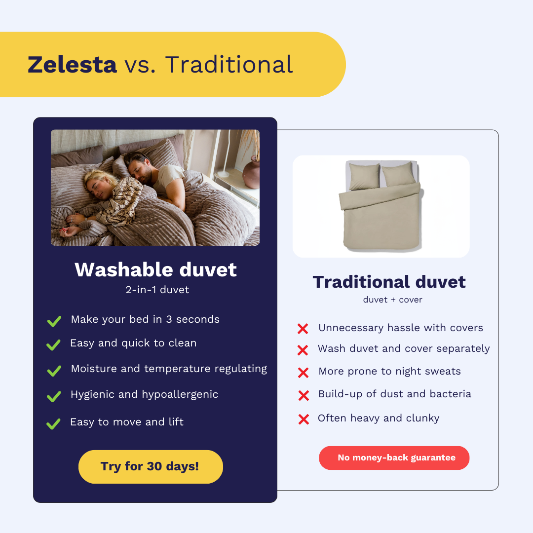 With Zelesta, that nightmare is over. Our smart duvets with integrated duvet cover save time, energy and money.