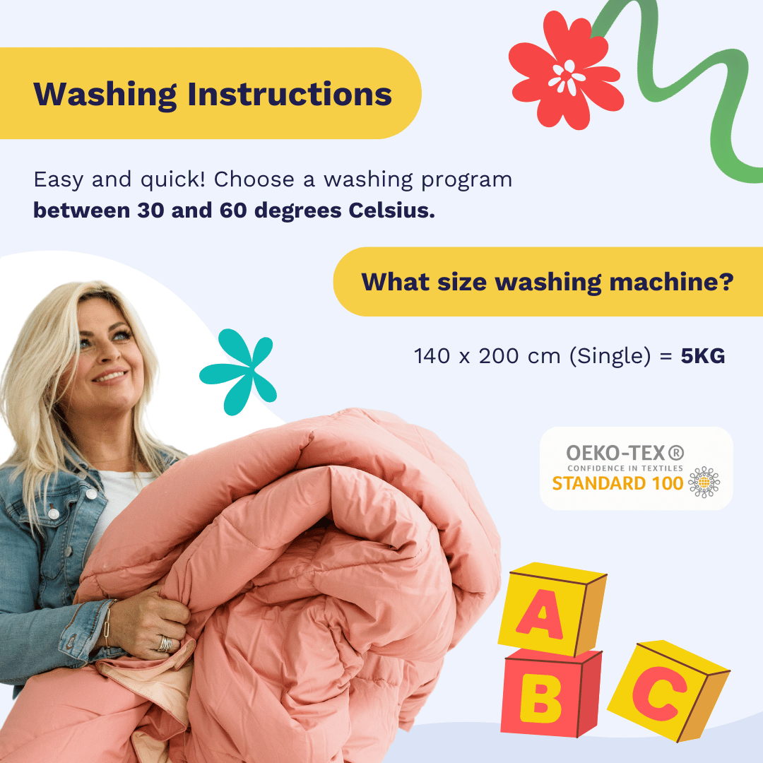 We recommend a maximum wash temperature of 60 degrees at a maximum rpm of 1000 degrees (40 degrees and 800 rpm for optimal product life). This washing instruction ensures that your duvet will feel fresh, hygienic and like new. Your washing machine will also remove dried-on stains, dust mites, dust molds and bacteria from your duvet at this temperature.