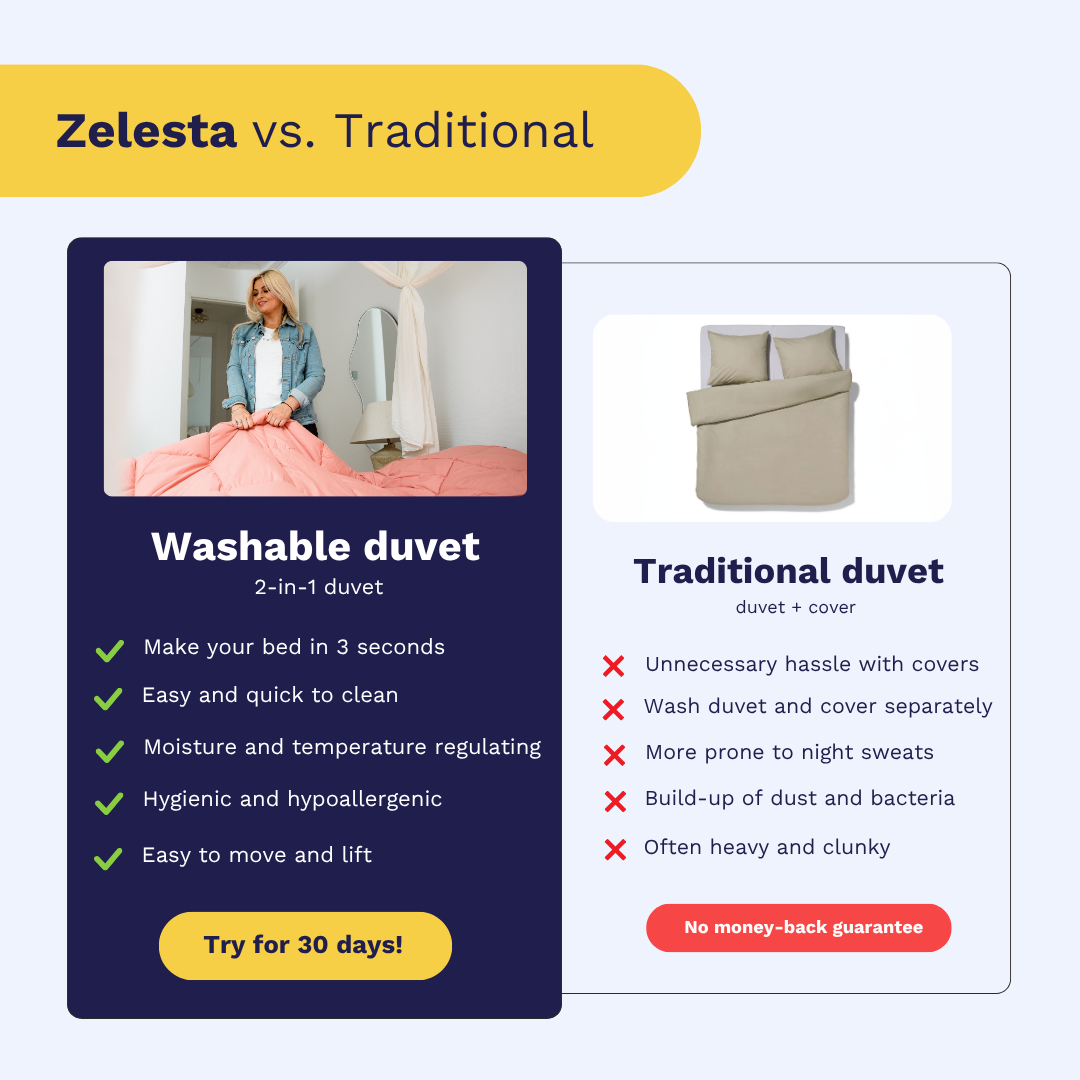 With Zelesta, that nightmare is over. Our smart duvets with integrated duvet cover save time, energy and money.