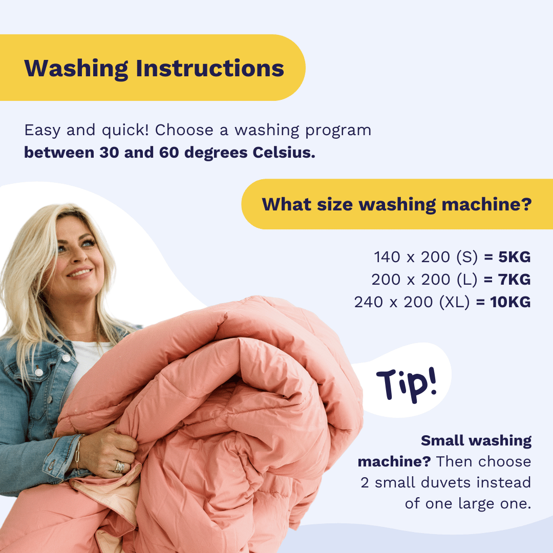 We recommend using a maximum washing temperature of 60 degrees and a maximum spin speed of 1000 revolutions (40 degrees and 800 revolutions for optimal product life). Following these washing instructions will ensure that your duvet feels fresh, hygienic and like new. In addition, washing at this temperature will remove dried-on stains, mites, mould and bacteria from your duvet.